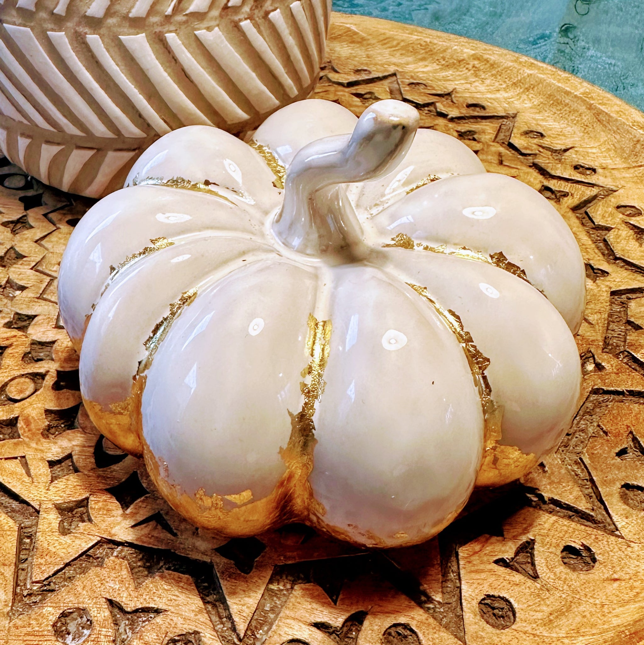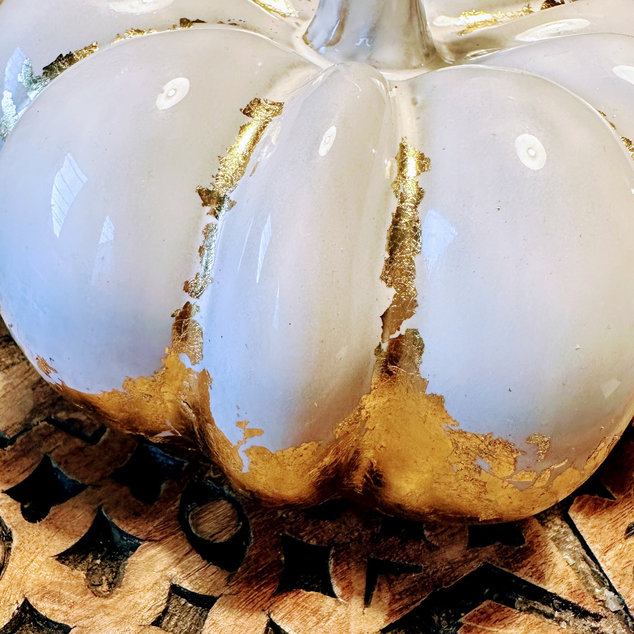 Keramikkürbis mit Blattmetall, Milchweiß und Gold, 15 cm