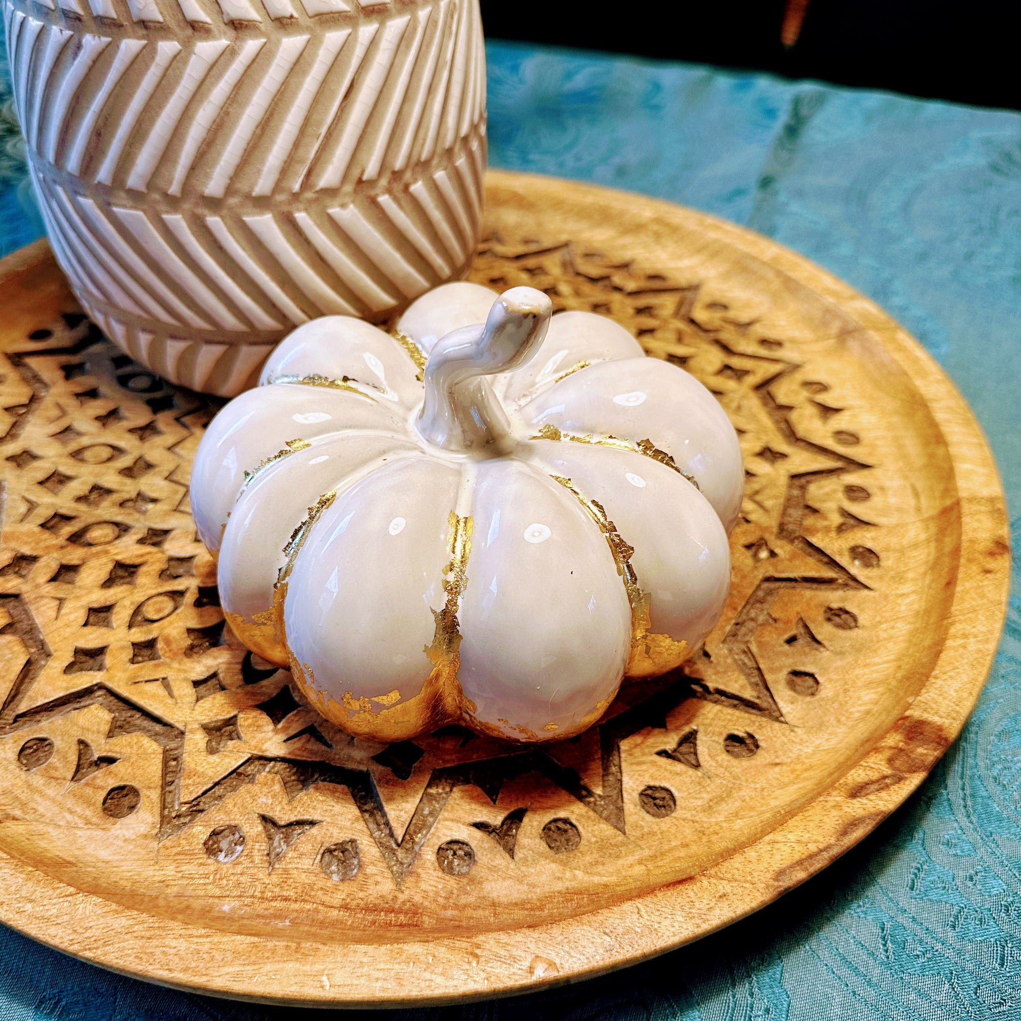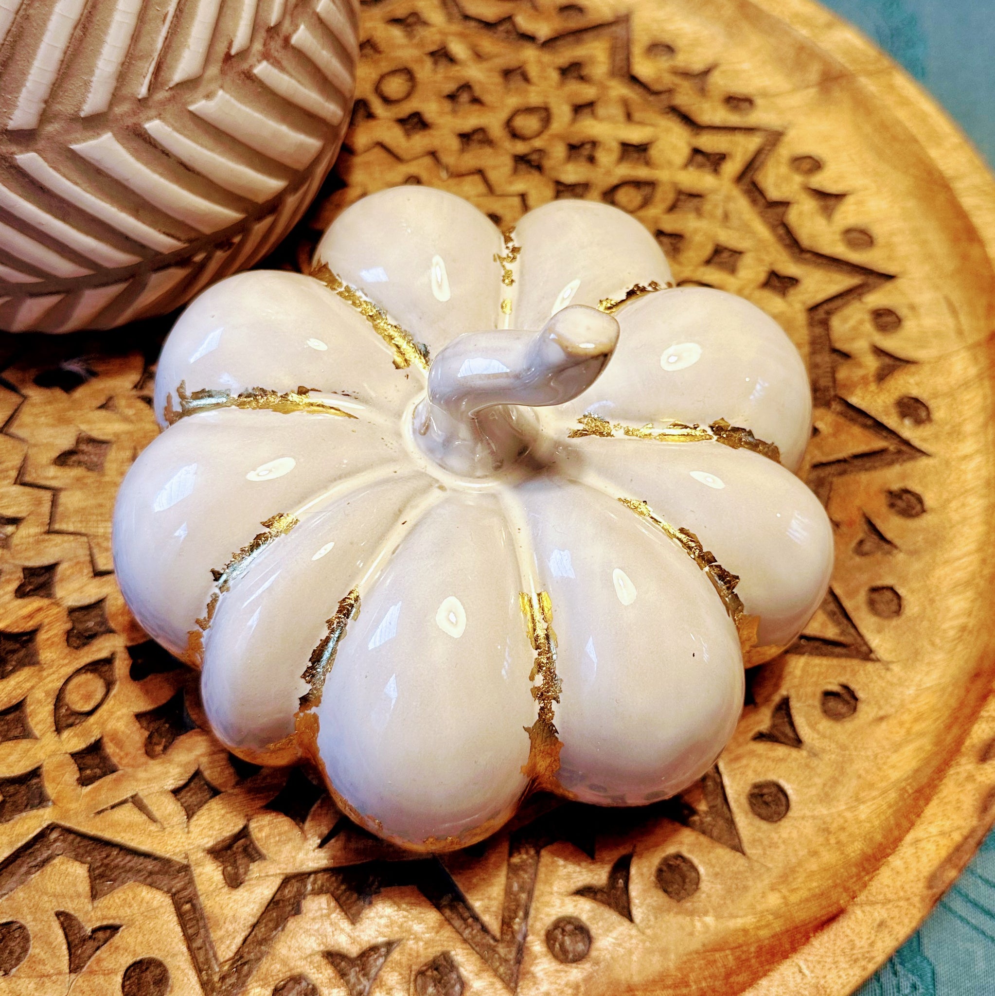 Dieser schöne Keramik Kürbis ist eine besondere Bereicherung für deine Herbstdeko. Gefertigt aus hochwertiger Keramik, überzeugt er durch seine schlichte Eleganz. Das Besondere: Der Kürbis wird von Hand mit feinem Blattmetall in Gold akzentuiert, was ihm eine edle und warme Note verleiht.
