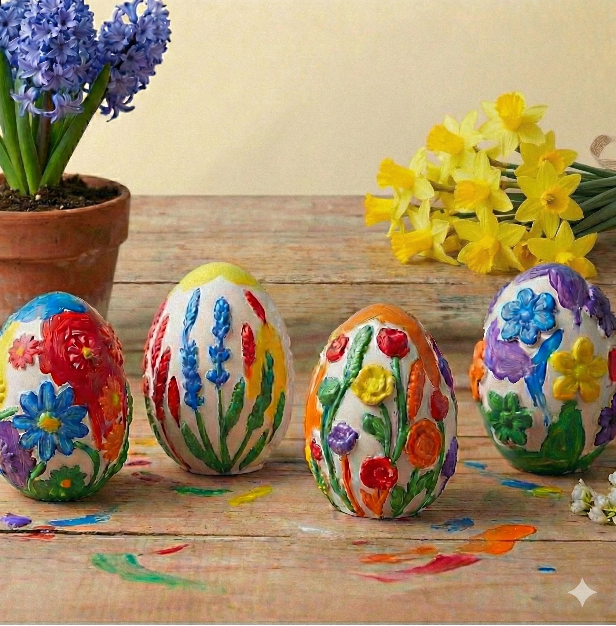 🎨 Farben-Zauber: Wir mischen unsere eigenen Lieblingstöne aus den Grundfarben und lassen mit Strohhalmen lustige Pustebilder entstehen. 🖌️ Stempel-Spaß: Wir entdecken verschiedene Drucktechniken und stempeln fantasievolle Muster und Bilder. 🌵 Steine verwandeln: Aus einfachen Steinen machen wir pflegeleichte, bunte Kakteen für das Kinderzimmer. 🥚 Deko-Werkstatt: Wir bemalen nicht nur Papier! Passend zur Jahreszeit gestalten wir wunderschöne Ostereier aus Gips.
