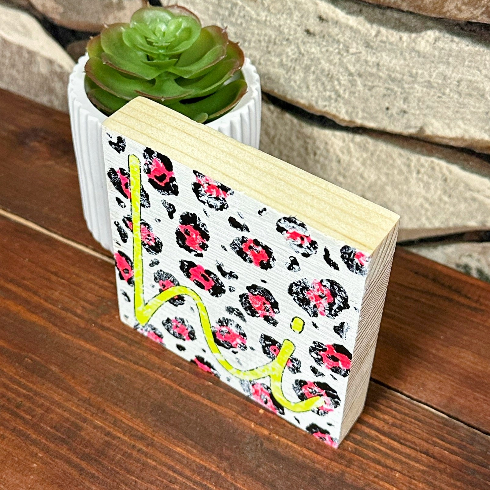 Bring mit diesem handbemalten Holzblock einen modernen Eyecatcher in dein Zuhause! Dieser dekorative Klotz vereint rustikales Naturmaterial mit einem trendigen Leoparden-Muster und einem frechen „Hi“-Schriftzug in leuchtendem Neon-Gelb. Jedes Stück ist ein echtes Unikat, das mit viel Liebe zum Detail gefertigt wurde.